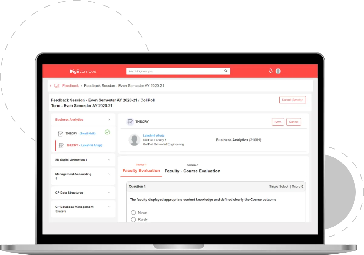 Digiicampus’ Faculty Feedback System is designed to create a feedback loop that empowers students to share their educational experiences and assess faculty performance, course content, teaching methods, and more.